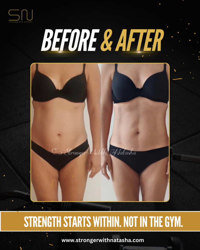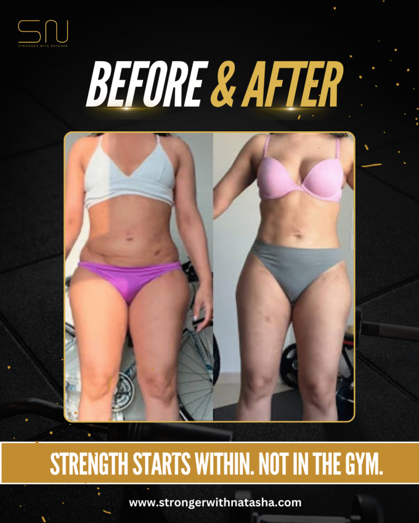 Together, we rewrote her story. We focused on mindset first — through journaling, habit-building, and a gradual shift in how she saw food and her body. Then, we rebuilt her training program: just three sessions per week, but designed specifically for body recomposition — the process of losing fat while building lean muscle.